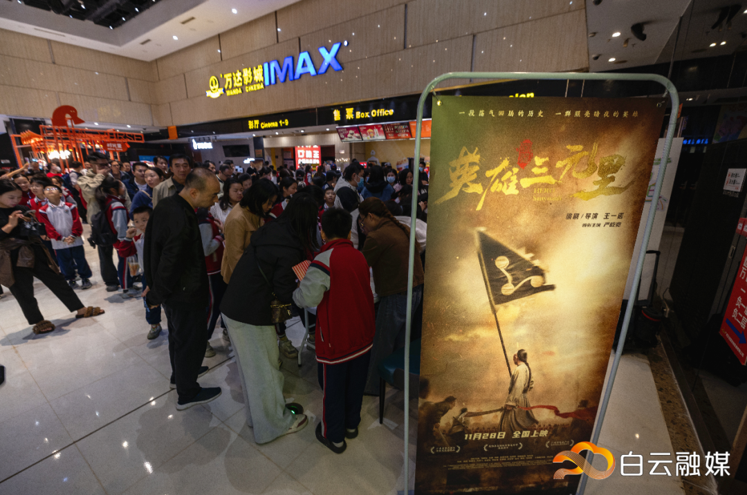 在白云万达影城,记者看到《英雄三元里》的宣发氛围浓厚:从商场1号门入口起,巨型电影海报和“观影请上3楼”的温馨提示展板一路引导;中庭悬挂着一条长达4米的条幅海报,视觉冲击力强;通道两侧,《英雄三元里》主题侧旗整齐排列,营造出热烈的观影氛围。